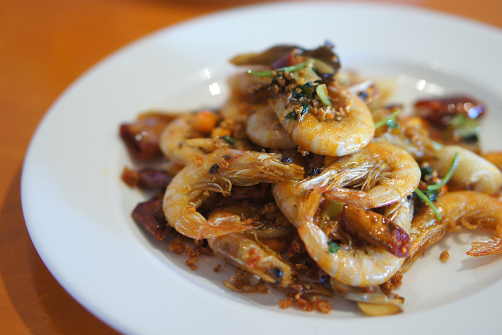 芝エビと食べられる唐辛子の炒め物 。これの鶏肉バージョンもあるらしく、それも絶品らしい。芝エビはカリッと揚げられていて、口の中が血だらけになるのでご注意ください。嘘です。でも刺さります。