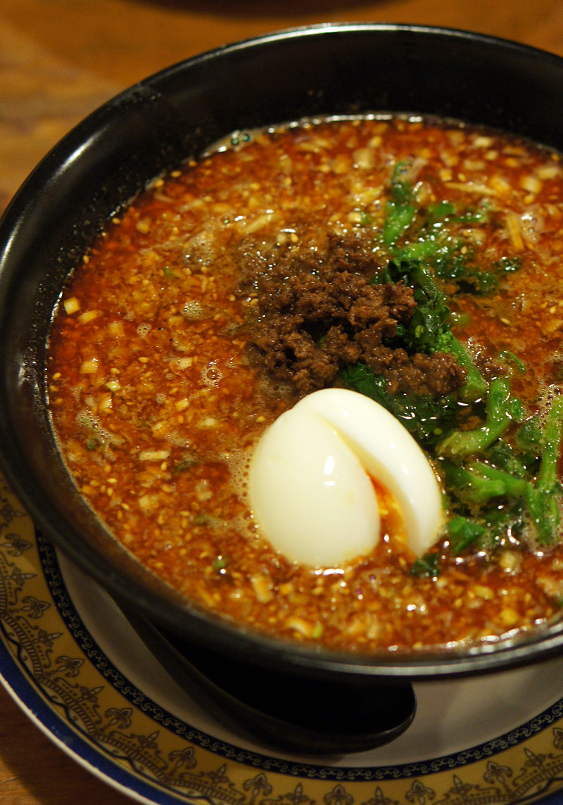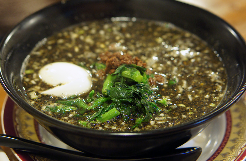 で、担々麺ですが、赤がいわゆる普通の担々麺。黒は黒ごまをつかったスープと黒ごまを練り込んだ平麺を使ったもの。どちらもあっさり系かな。どろどろしてる感じじゃなく食べ易いタイプ。