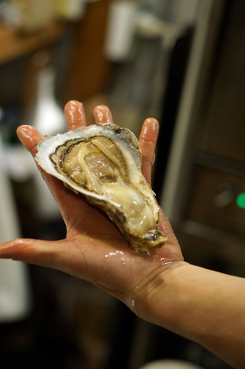 でかっ!!!常連のお客さんが鹿島市の牡蠣小屋から取り寄せたらしい牡蠣。なんじゃこりゃ。でかっ!!ケンジさんが殻と悪戦苦闘しているところを除きこんでる皆さんw