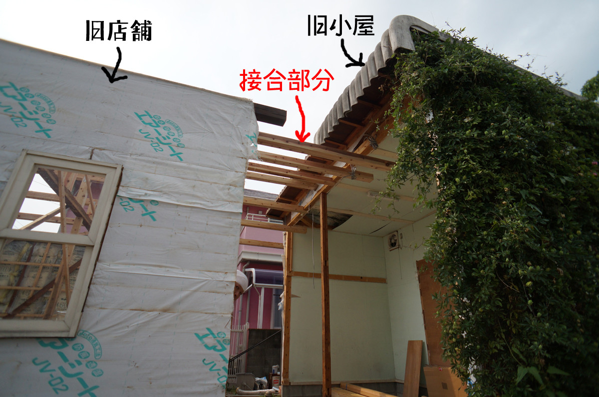 さて、隣の家鴨軒の工事の進捗状況と言えば、こんな↓↓↓感じです。ついに裏小屋と店舗部がつながりよる。楽しみね。