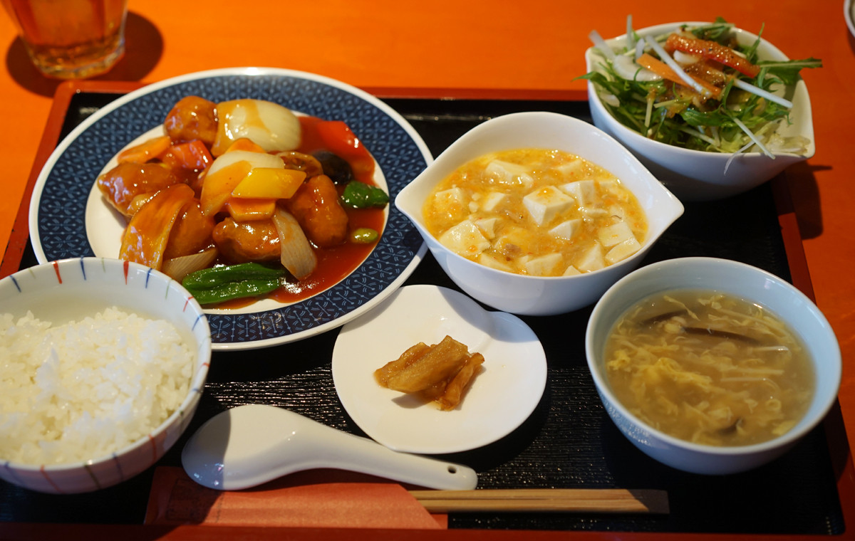 「四川料理 巴蜀」で日替わりのAランチ800円なり(4月からは850円)。ご飯少なめでお願いします。今日は、“豚ヒレの酢豚と蟹味噌もどきと豆腐の煮込み”。