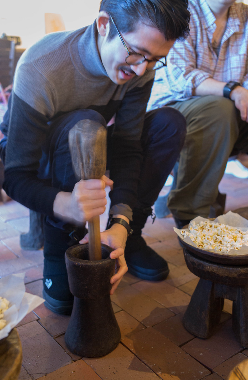 コーヒーミルは使わない。木の臼と木の棒を使って突いたりコネたりしていく。突く!!突く!!