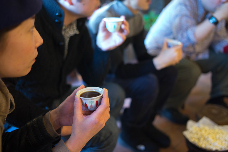 客の前でコーヒーの生豆を煎るところから始め、3杯飲むことが正式であることから、1時間半から2時間以上かかる場合もある。