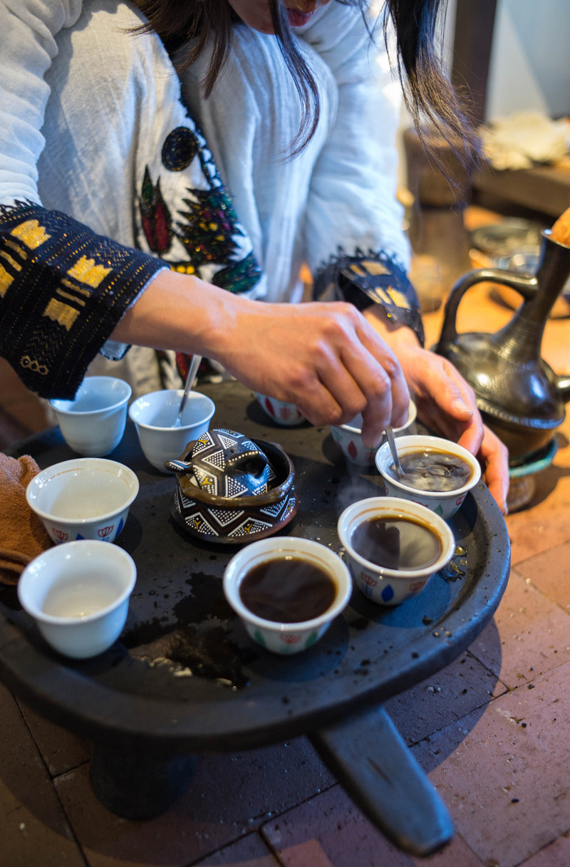 エチオピアでは砂糖を入れて飲むのが一般的。たまには、塩やバターを入れて飲む地域もあるらしい。