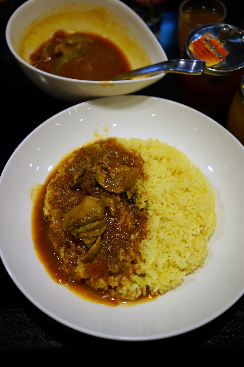 ドゥニヤの看板メニューである北インド風チキンカレー+2辛をジャスミンライスで。