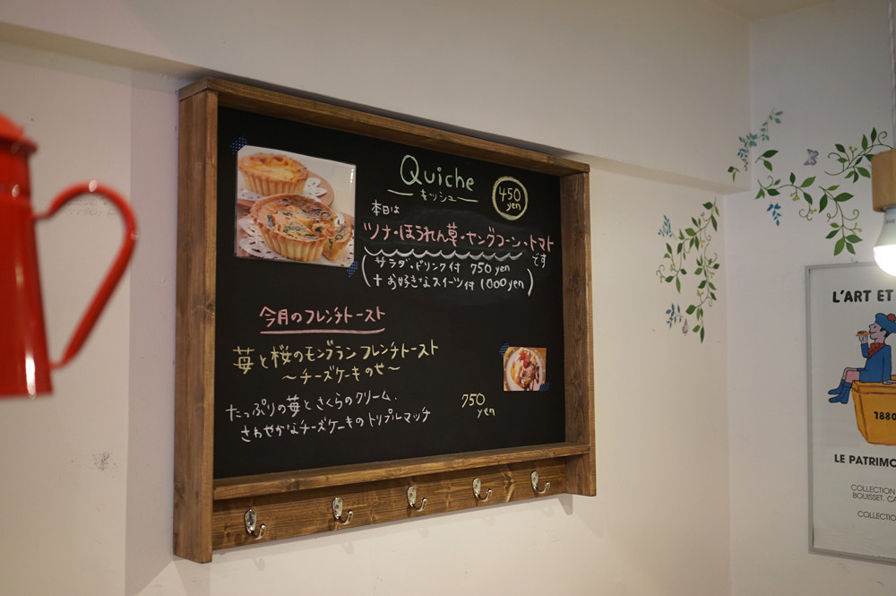壁にかけたメニューボードの枠もテーブルの天板と同じ感じで落ち着きました。