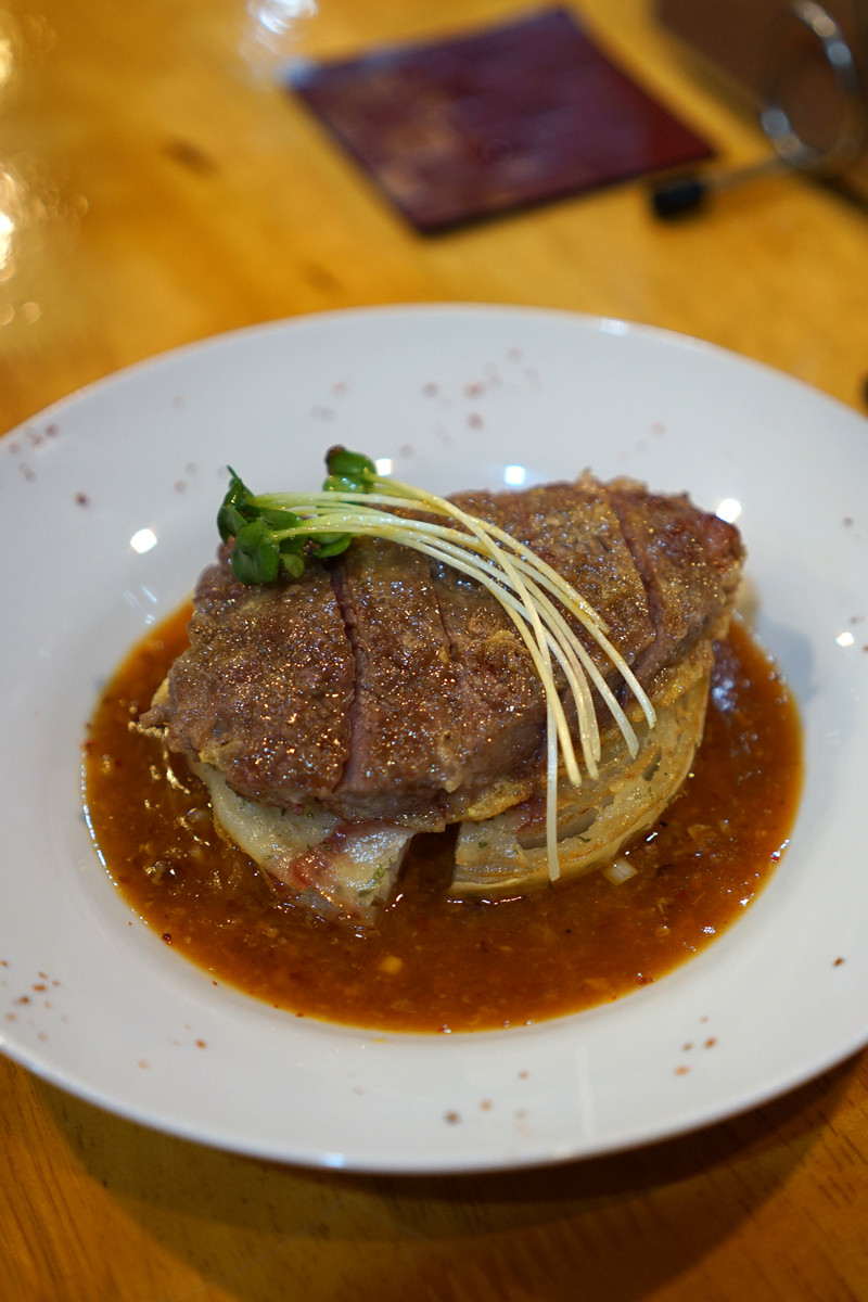 これ、最近の新メニューで“アンガス牛のステーキ〜四川ソース〜玉ねぎのサクサク揚げ添え”だそうです。通常はパクチーが載ってます。