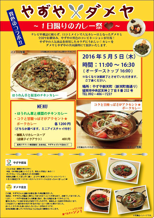 Y店主が博多どんたくの真っ最中に天神のどまんなかでコラボイベントなんて、いつものアングラなカレー屋のイメージからすると、なんか面白いね。