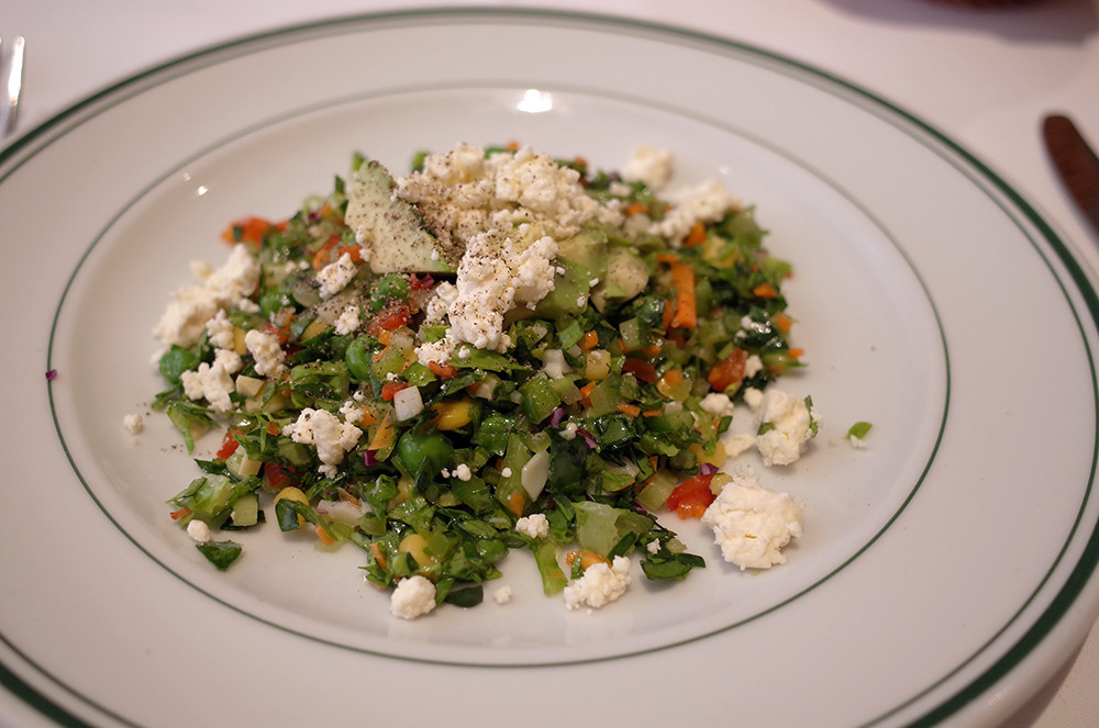 サラダは、十種類の野菜とチーズのサラダ。1人前(1,800円)を2人でシェア。 写真は、1/2にしたもの。