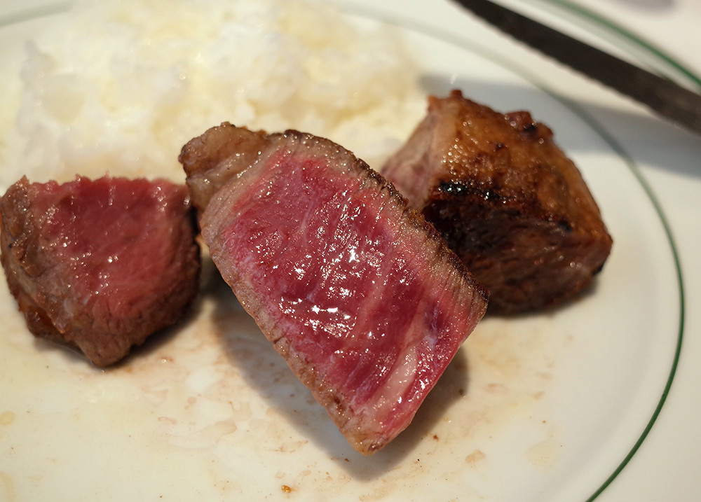 やはり、美味しいね。血の滴りも少なくしっかりと旨味が凝縮されてる感じ。熟成肉(エイジングビーフ)ってハッキリした基準がないので僕の中でのいまいちイメージがアレやったけど、これは、美味しいと思った。特にヒレ。