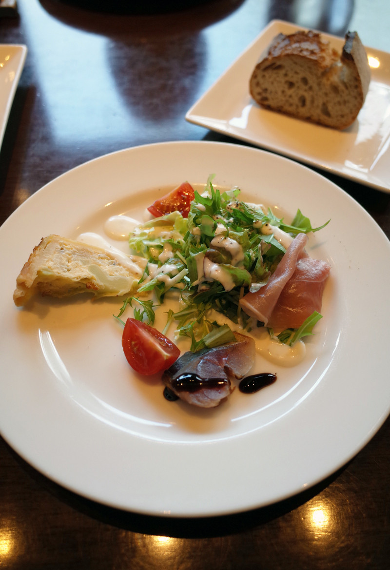 まずは前菜とサラダ。キッシュ、サバの燻製、生ハムと野菜サラダ