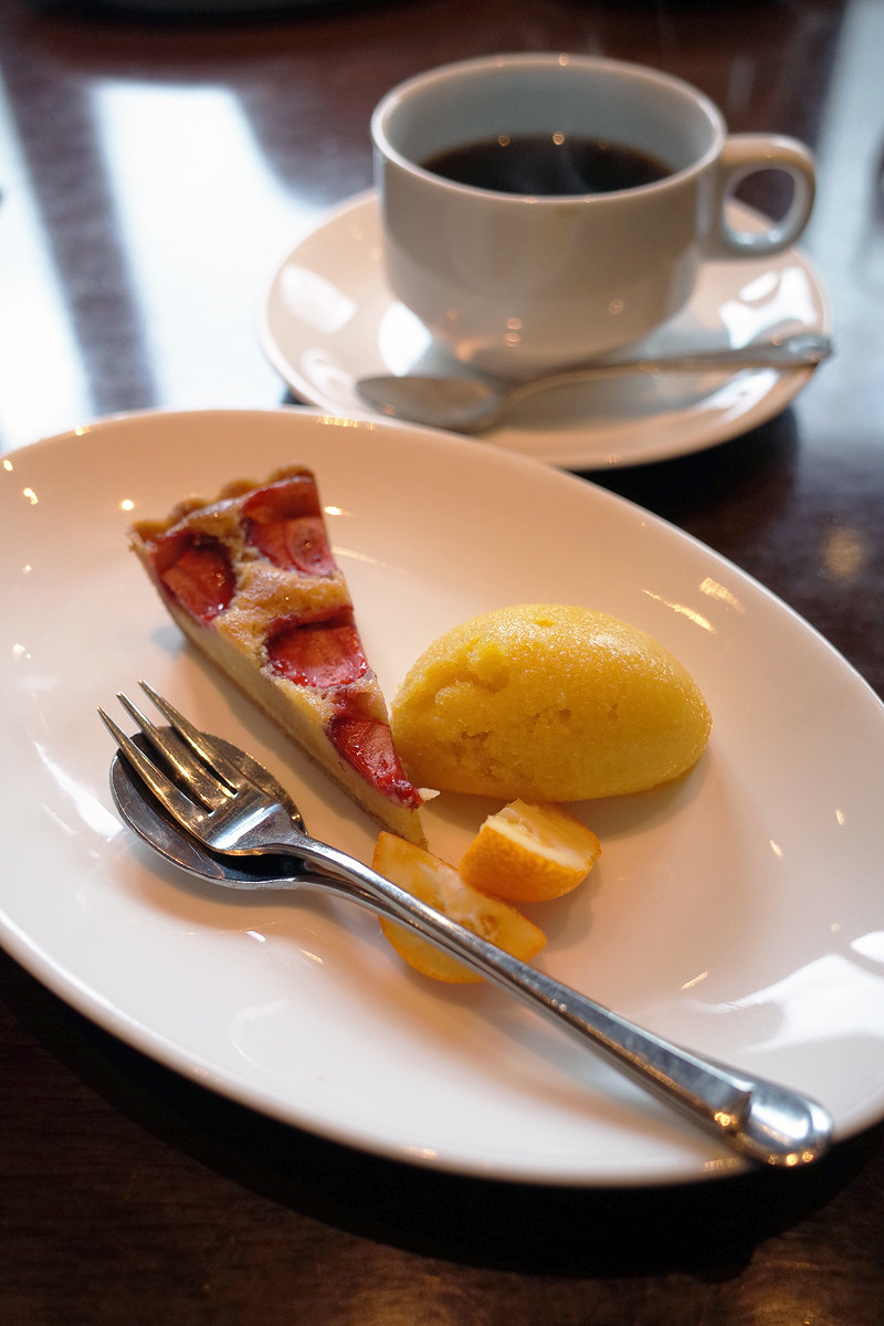 デザートは、あまおうのタルトと柚子のシャーベットと金柑。ドリンク付き。