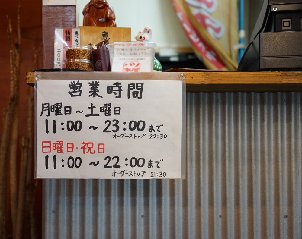 時間: [月〜土] 11:00〜23:00 (O.S 22:30) / [日] 11:00〜22:00 (O.S 21:30)