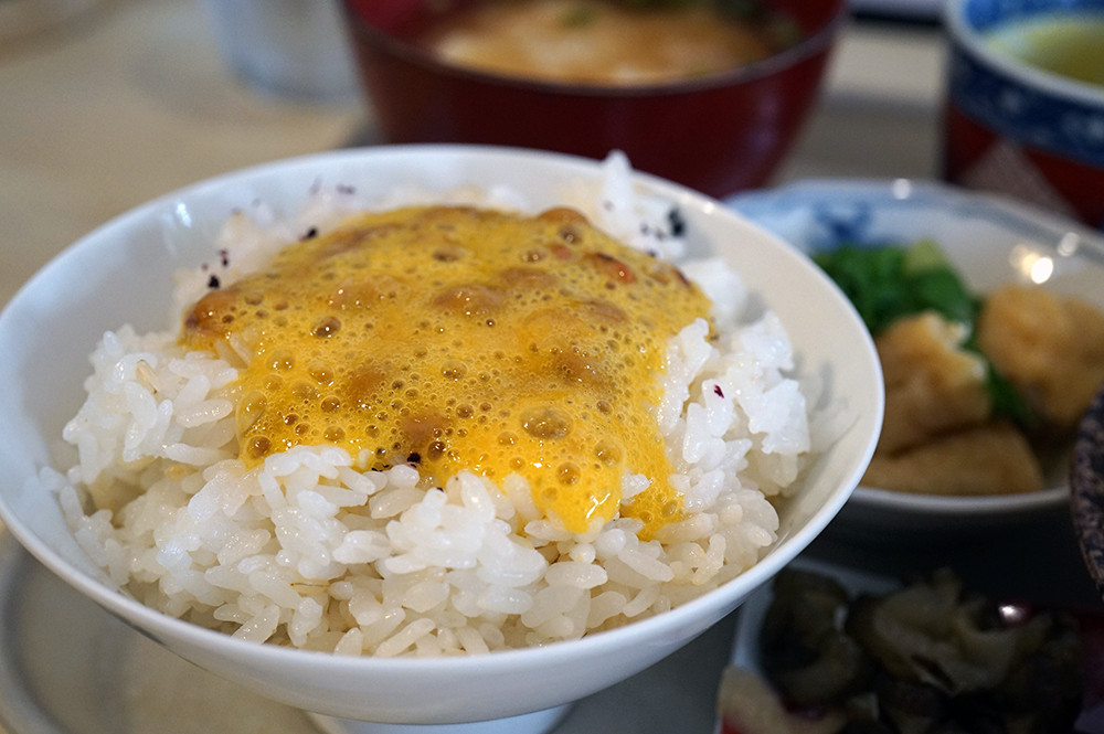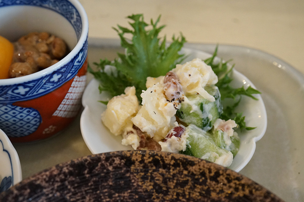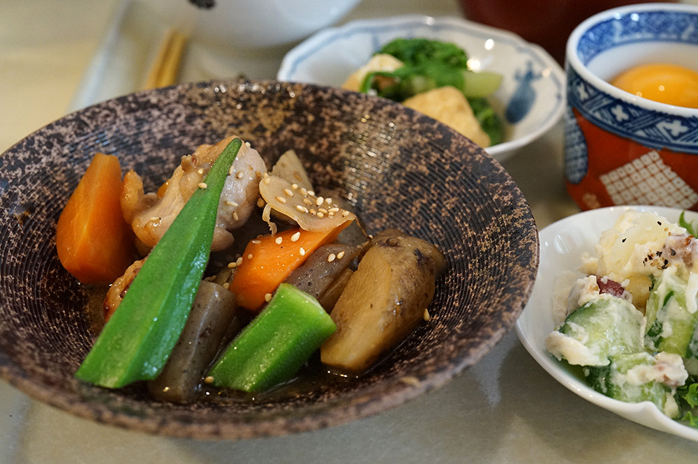 鶏ごぼう。玉子付き納豆でご飯大盛り。