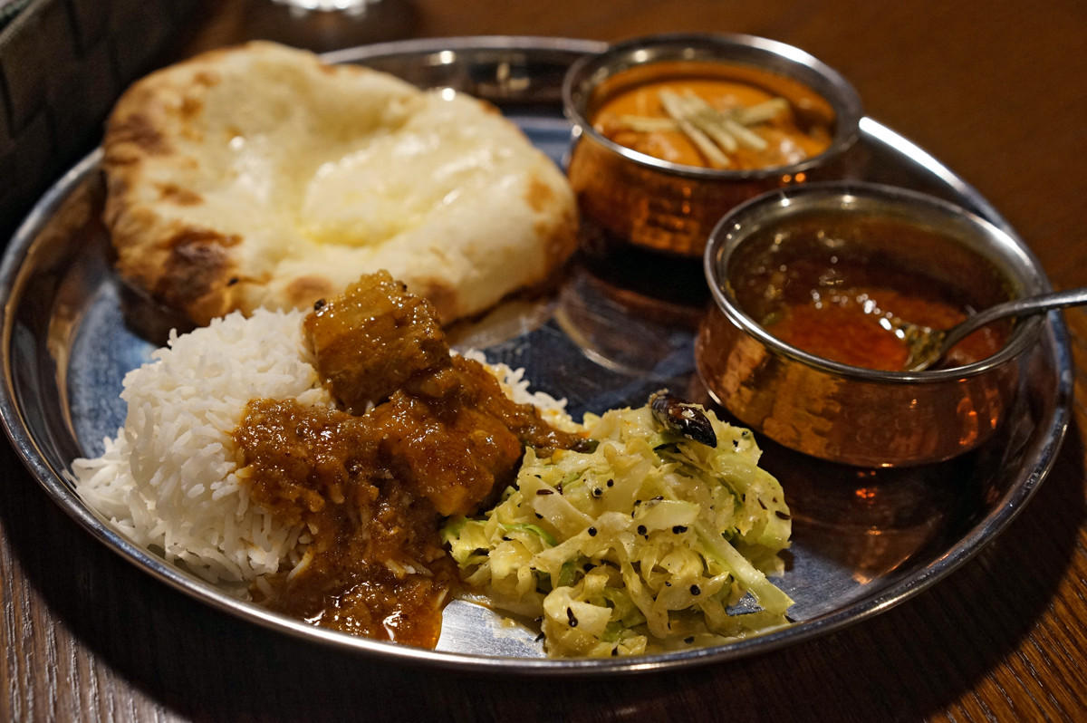 今日のカレーは、ポークビンダルーとバターチキン。それにバスマティライスとチーズナンを合わせる。