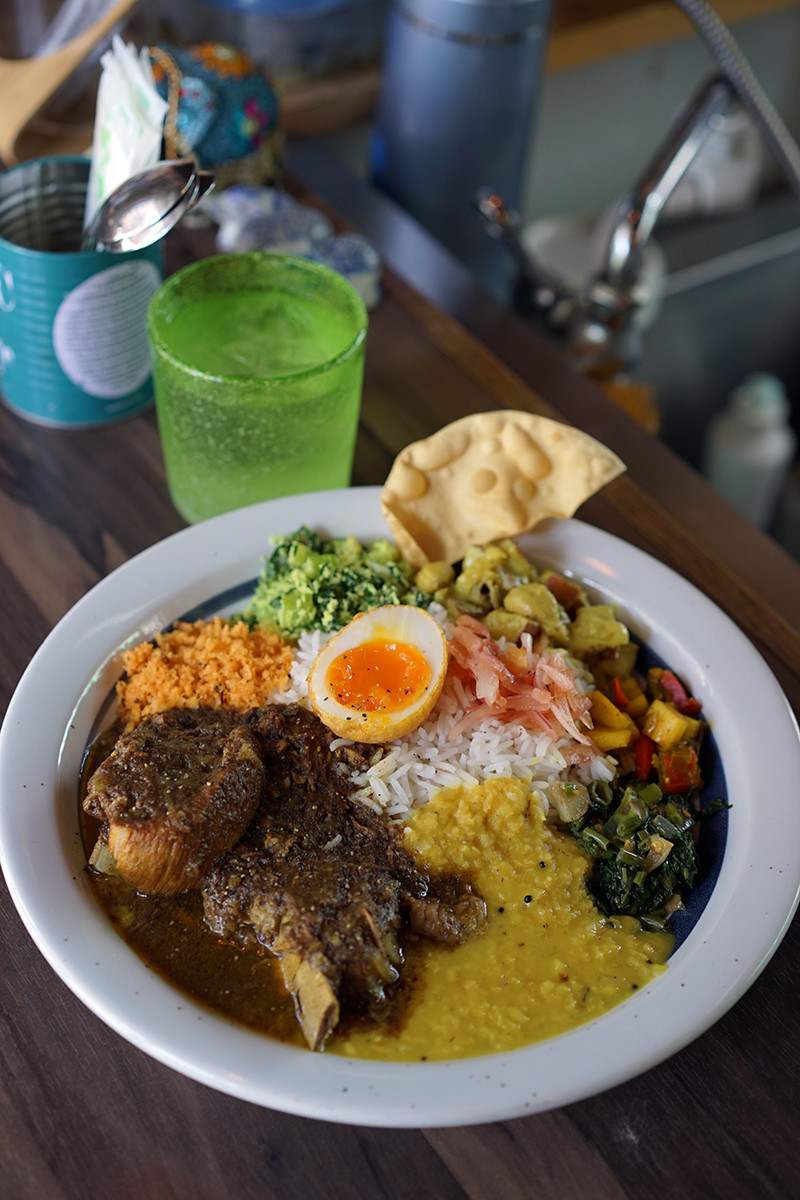 今日のプレートは、スペアリブのカレーをメインにいろんなカレーや副菜がたっぷり。Mサイズで1,000円という大きさを注文したけど、これでも十分お腹一杯。