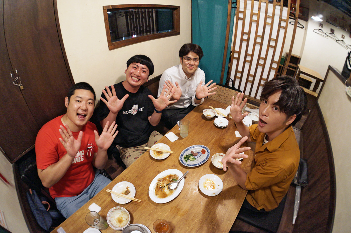 ハレルヤくんと同じ事務所の先輩芸人のノボせもん まーちんと、歌手&タレントのタケルくん。それとカメラ&編集担当のアベ先生。