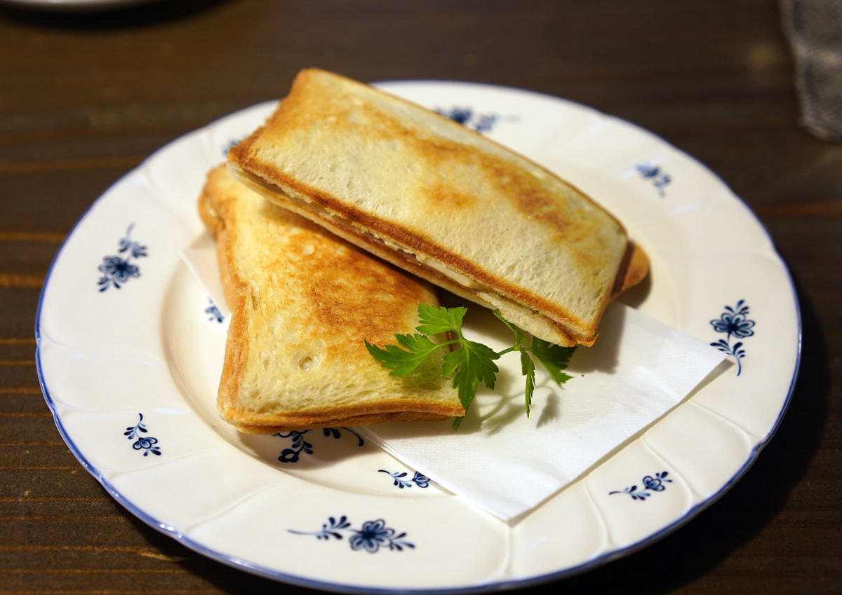 お昼ご飯は【マスカル珈琲】でホットサンドと珈琲。味付け玉子が一個入ってて美味しい。
