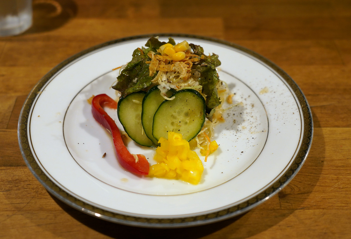 サラダとプリンのセットと、煮玉子とマッシュポテトも追加。サービスの紅茶もついて、締めて税込みで1,404円。なかなかのお得感。