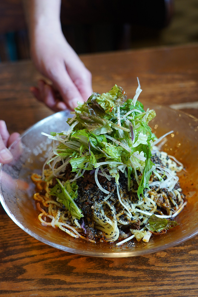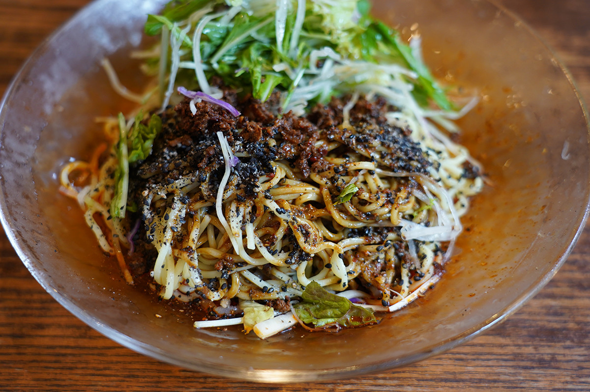「週替わり定食の青椒肉絲(チンジャオロース)は売り切れました〜」とのことだったので、週替わり麺のラー油の辛みが効いた黒胡麻冷麺を注文。