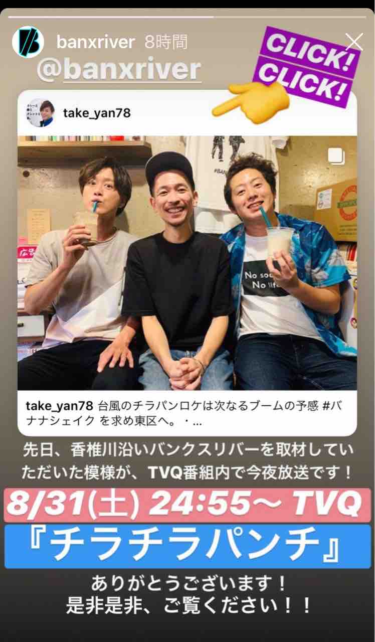 からの【Banx River】へ。今夜この後24:55からTVQ『チラチラパンチ』にケンゴが登場しますよ!!お楽しみに。今夜はタケルもまーちんも出るよ。