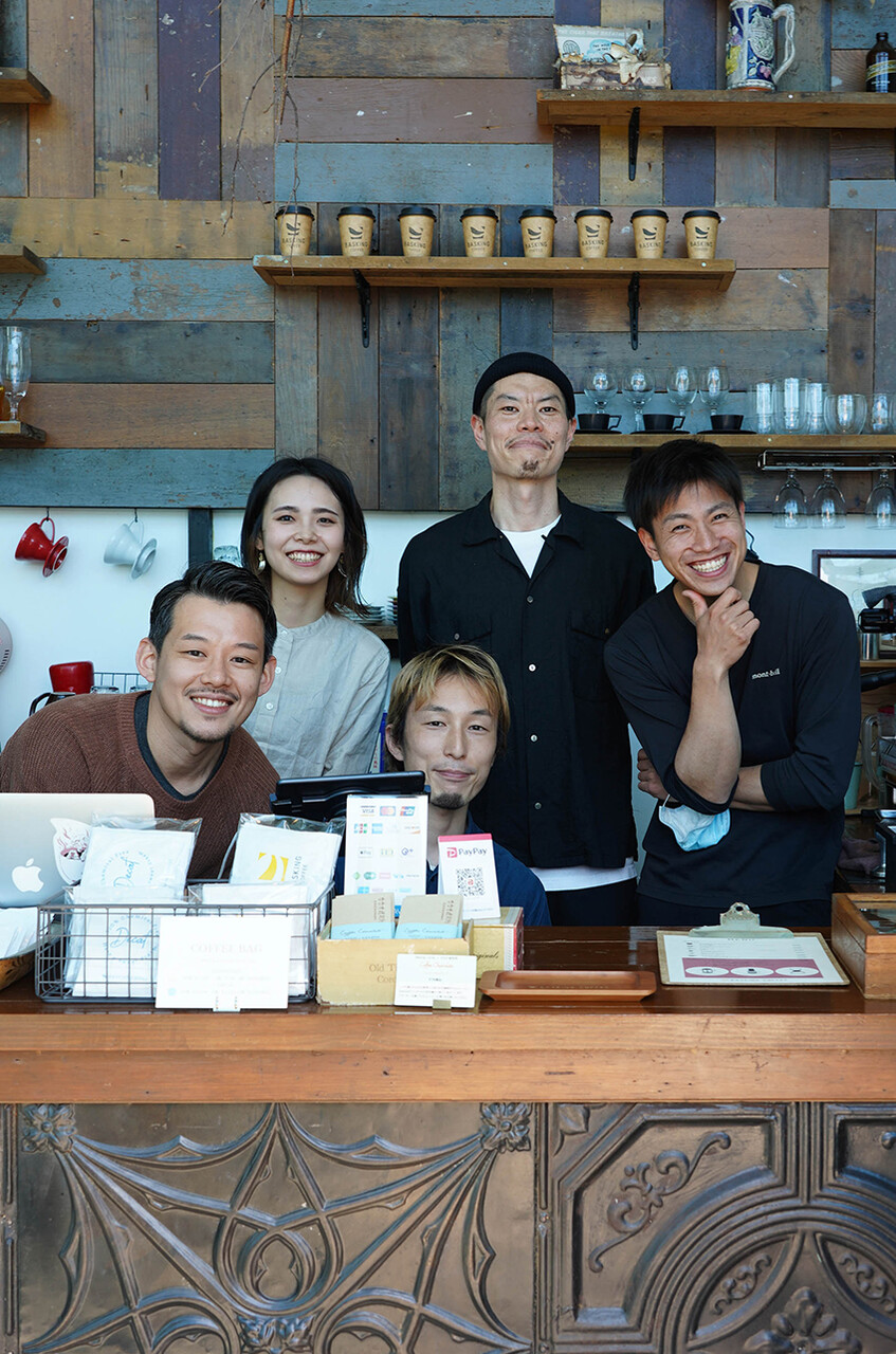 彼が東区のお客さんに支えられて一人前のコーヒーマンとして成長したことは榎原店主(前列中央)と同様に彼を応援して来たお客さんの喜びでもあると思う。