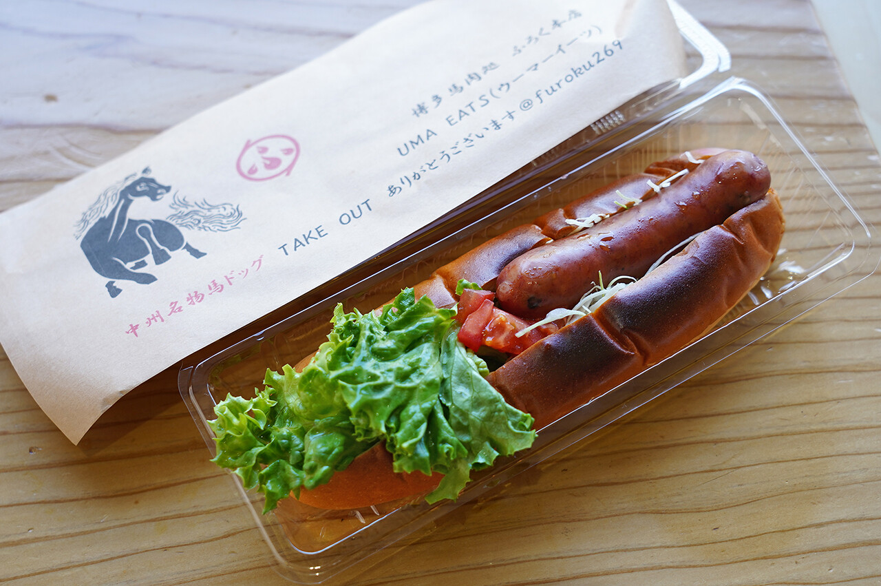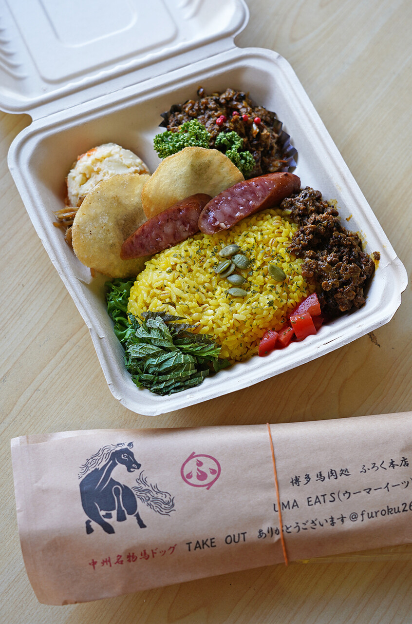 【とり焼肉エイト】にいたら【博多馬肉処 ふろく】の馬肉カレーと馬肉ソーセージのホットドッグの差し入れがあったのでご紹介。