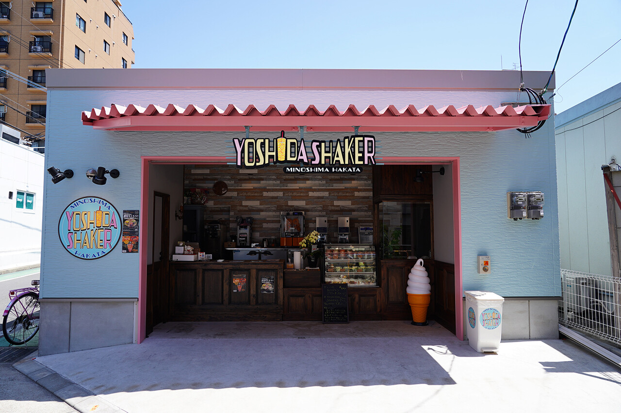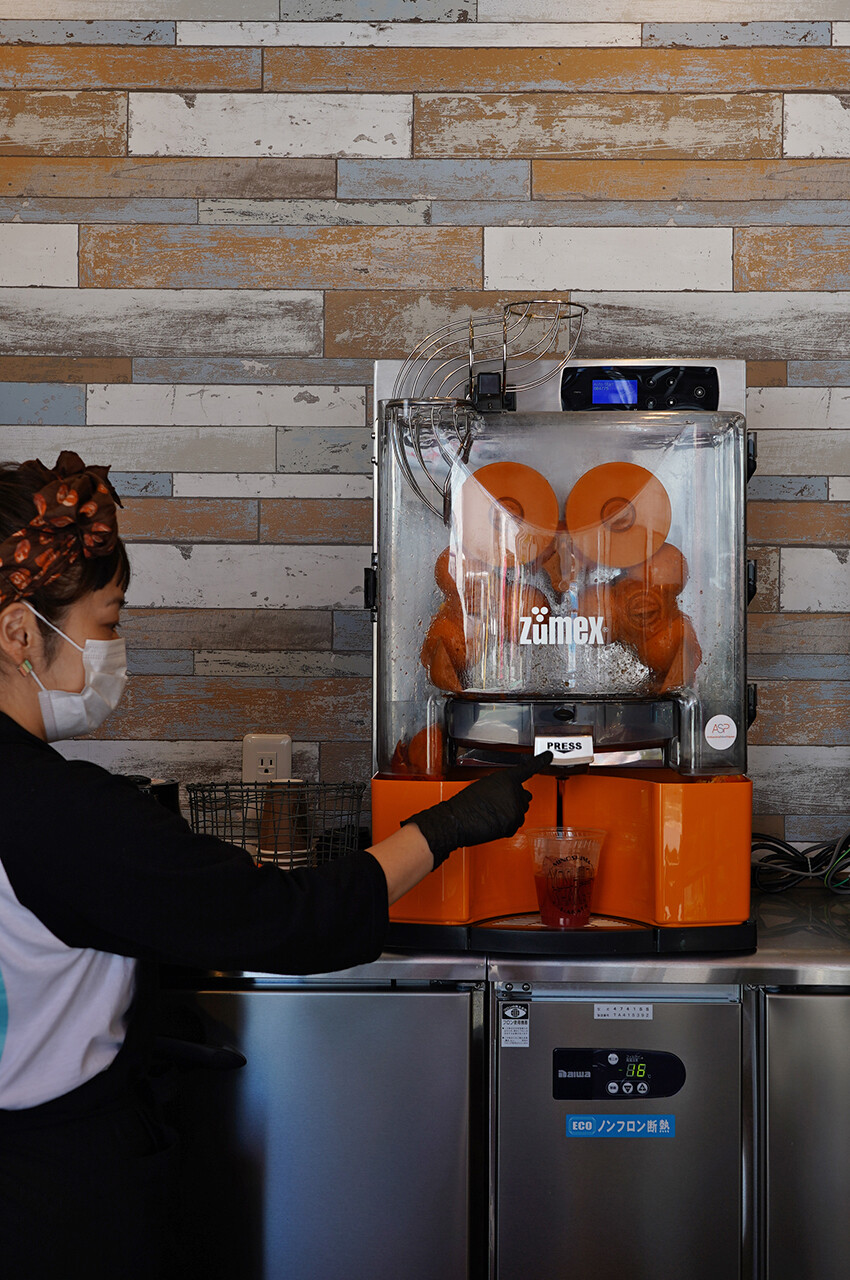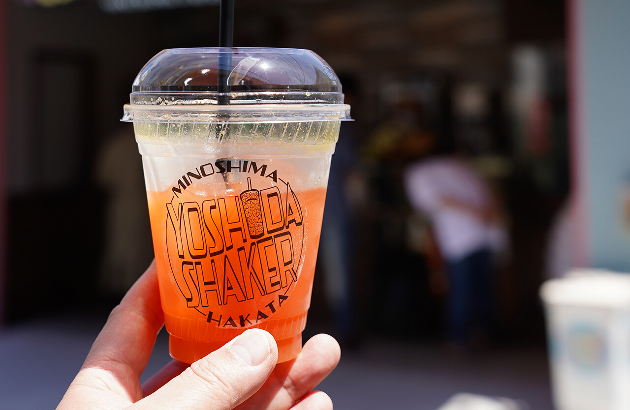 同じ商店街にある【ヨシダシェイカー】でオレンジジュースを飲みに。人気の青果店【吉田青果】が新しく始められたテイクアウト専門店。