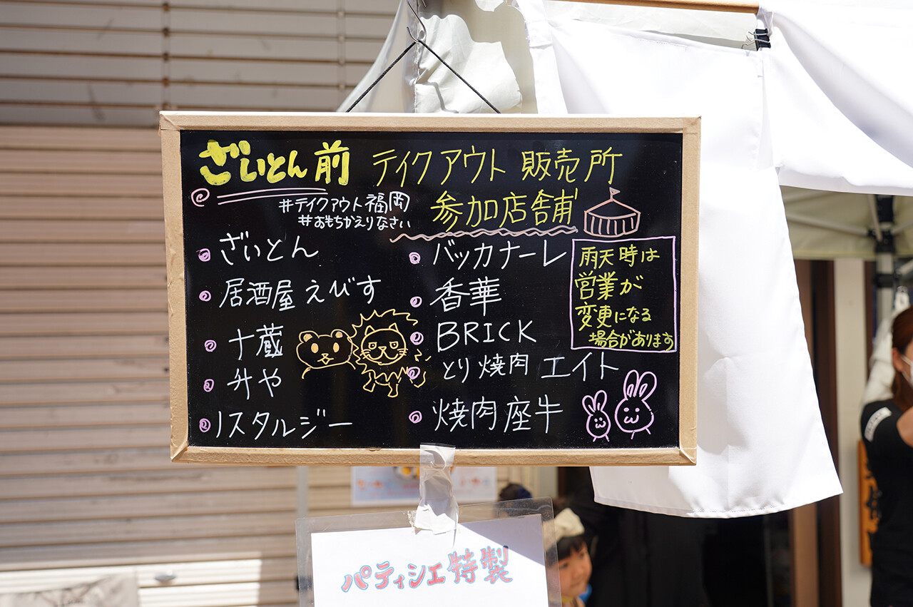 【ざいとん】を中心に、4月7日に出された非常事態宣言の後から店前にテントを張って地元のお店と共同でお弁当やスイーツなどを販売してきました。