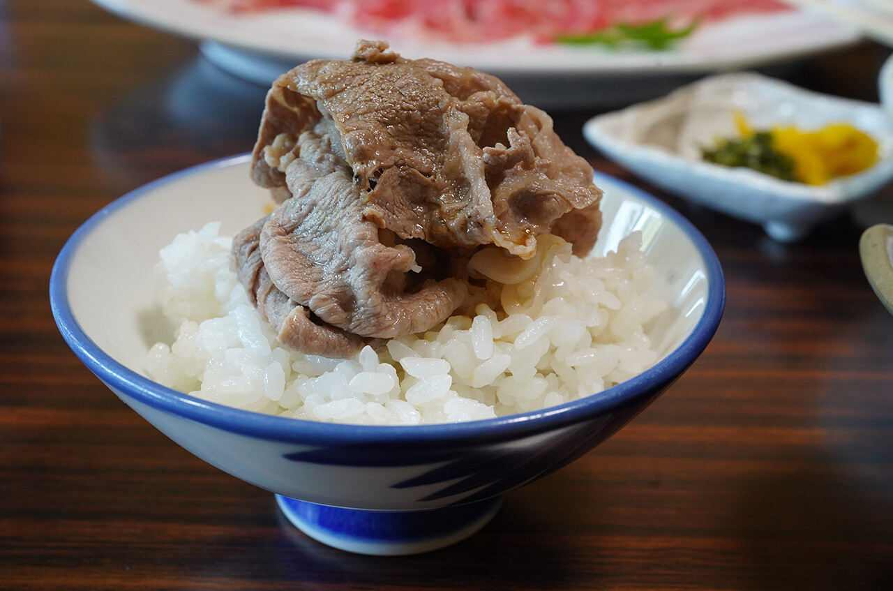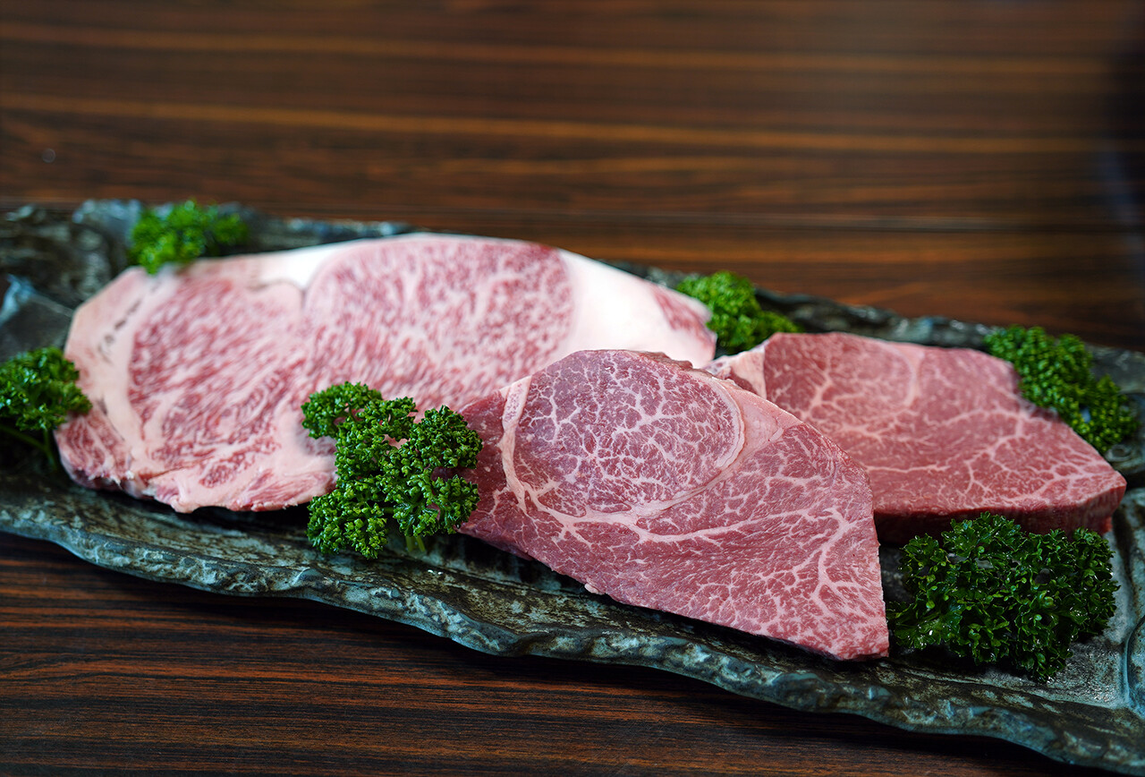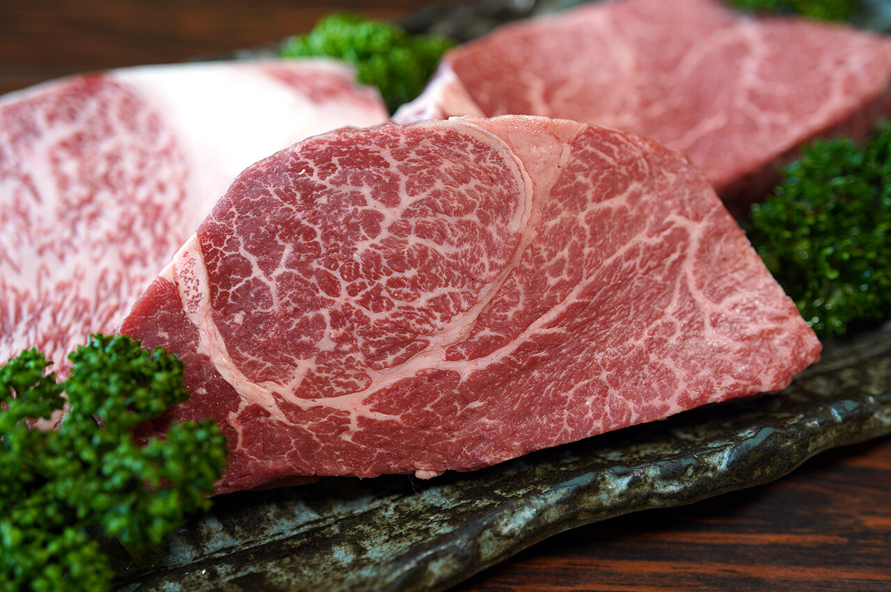 美しいサシが入った柔らかい肉。独自の配合飼料を使ってストレスを少なくして育てられた黒毛和牛は、どんどん食べてもモタれることなくサラリとお腹に落ちていく。