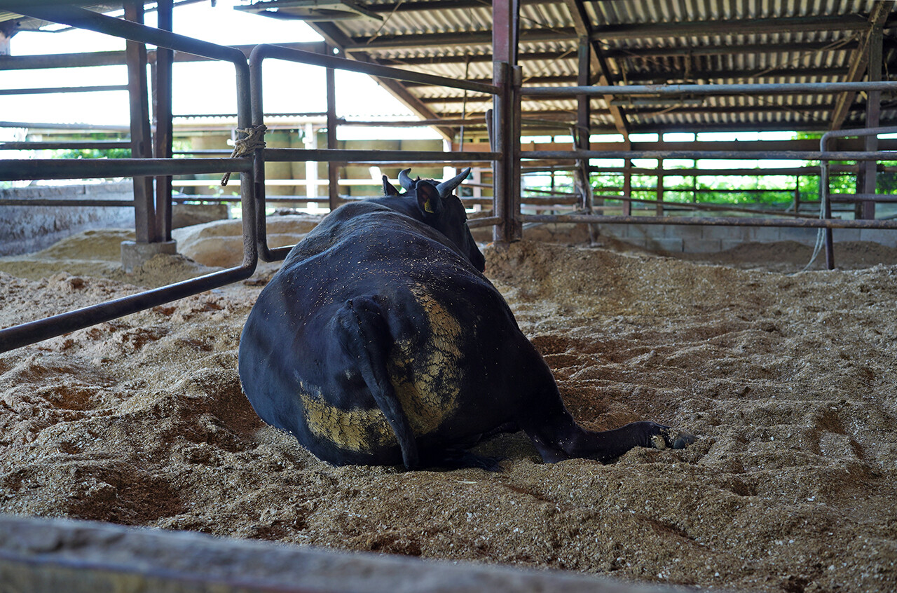 この牛は、良いお尻をしているそうだ。三日月状に付いてる泥みたいなのはウンチ。これのつき方で尻の形の良さが分かるらしい。
