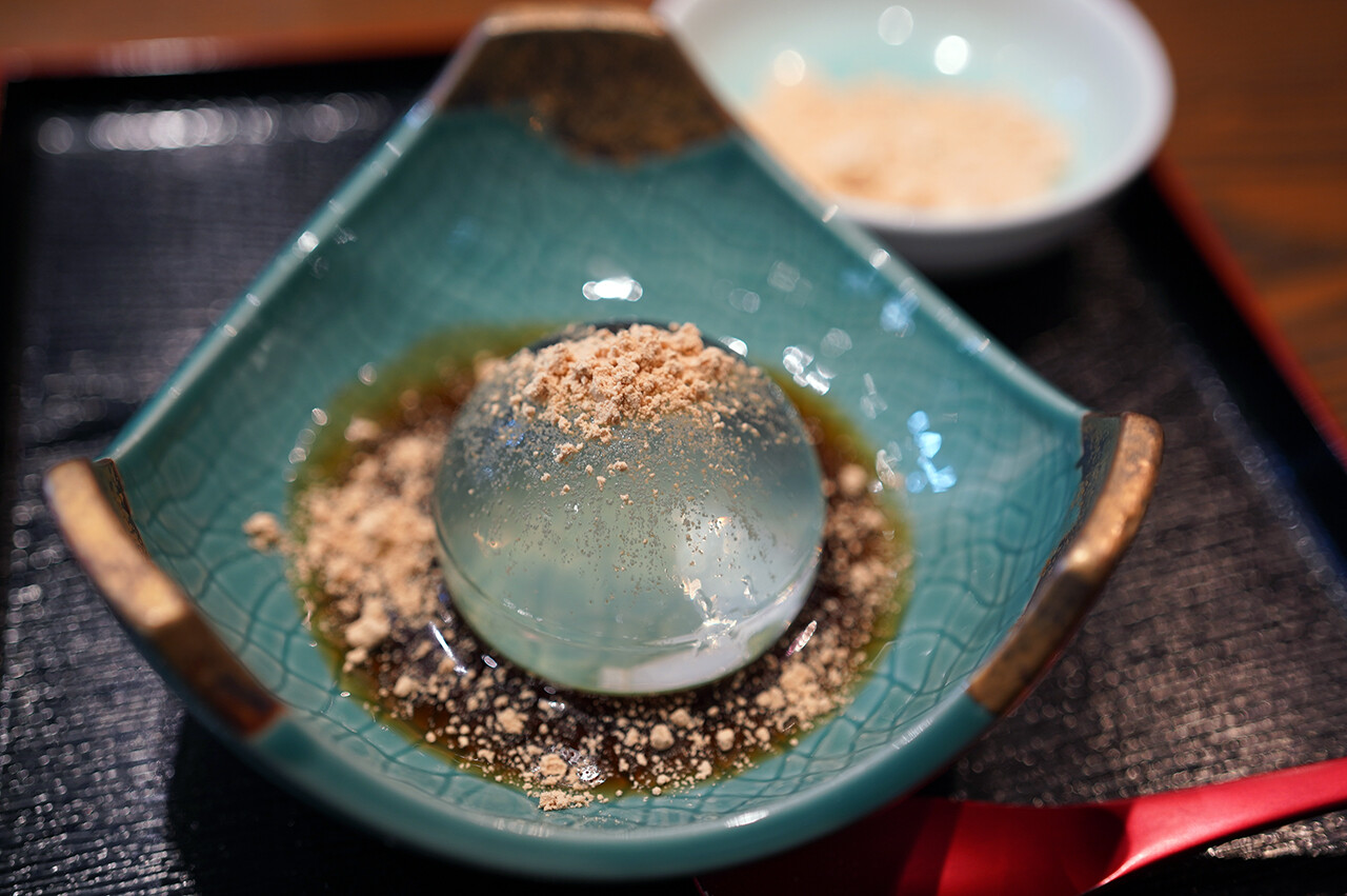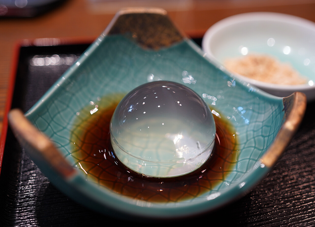 水信玄餅。黒蜜と黄な粉を絡めていただき。