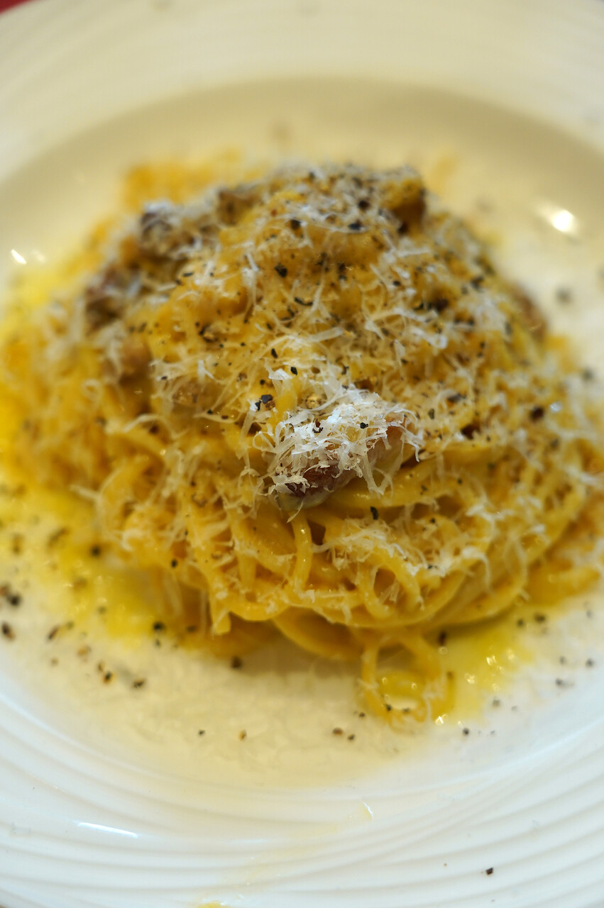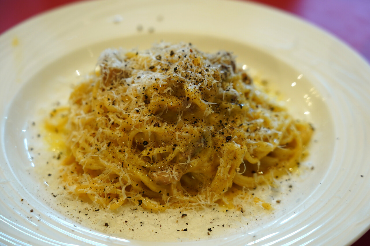 上の写真はミルクを使わない本場イタリアのカルボナーラ。自家製ベーコンとブラックペッパーの香ばしさを玉子が丸くまとめていて美味しかった。