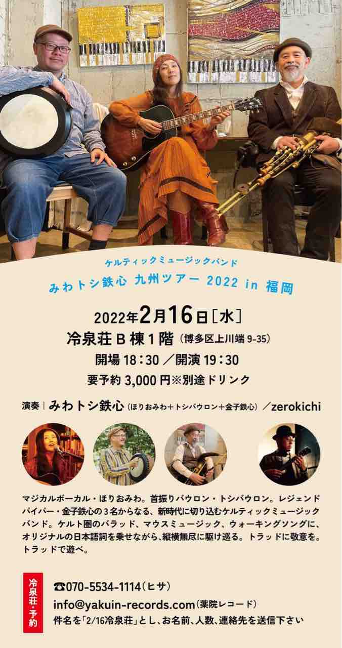 3人は今日から九州ツアーが始まり、2/16に博多冷泉荘に戻ってくららしい。スコットランドやアイルランドの音楽に興味がある方は是非。
