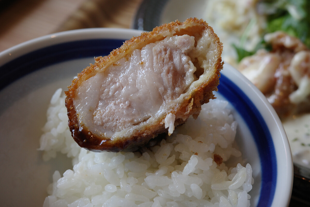 お昼ご飯は3人で 【肉菜処かえる屋】。イチボのステーキ、Aセット定食、とんかつ定食などいろいろ。COVID-19明けな感じで賑わってた。