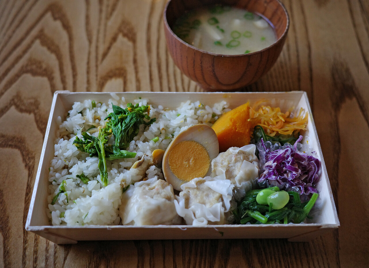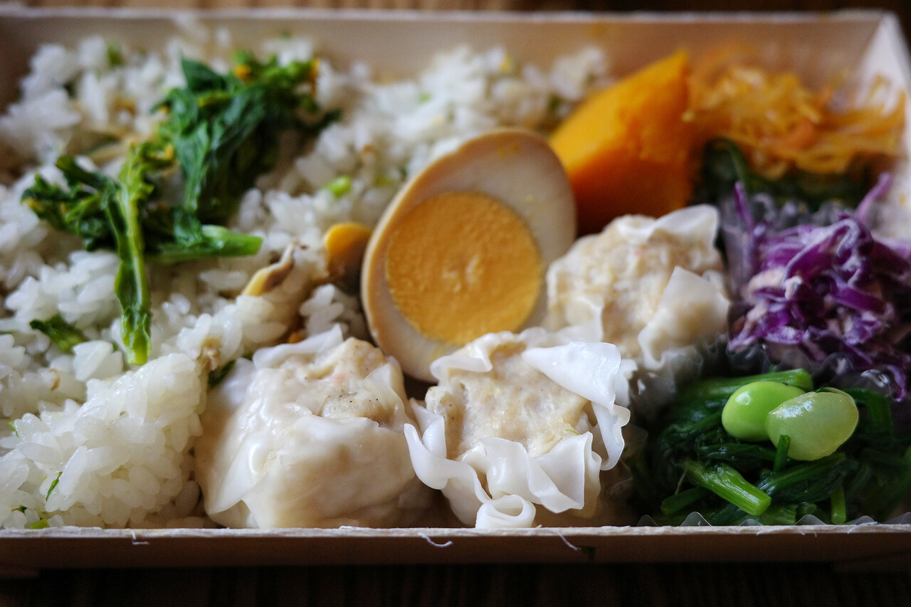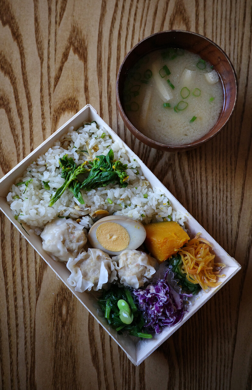 今日のお弁当はあさりと菜の花の炊き込みご飯、鶏肉と新玉ねぎの焼売、煮卵、など。日によっては揚げ物やら肉料理もあるみたい。特に木製の弁当箱にはこだわったそうです。