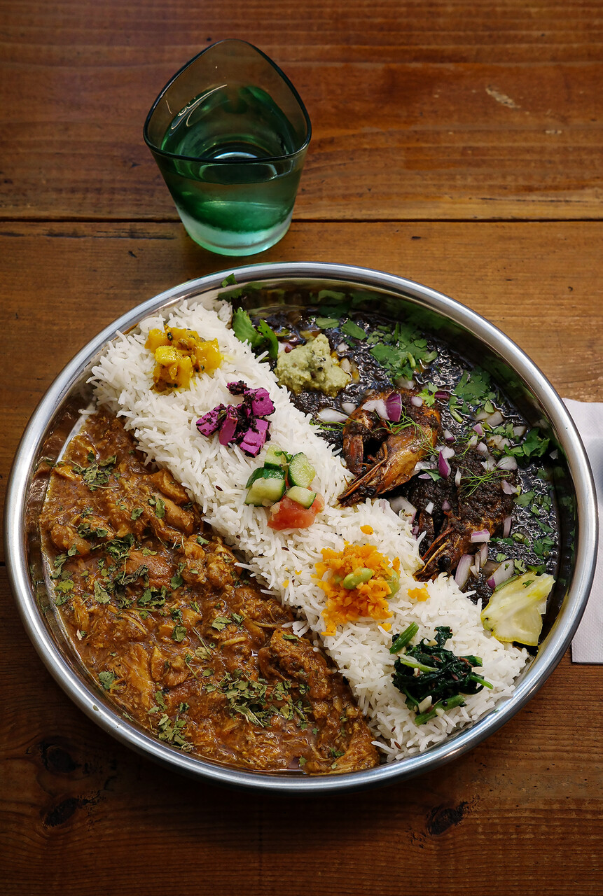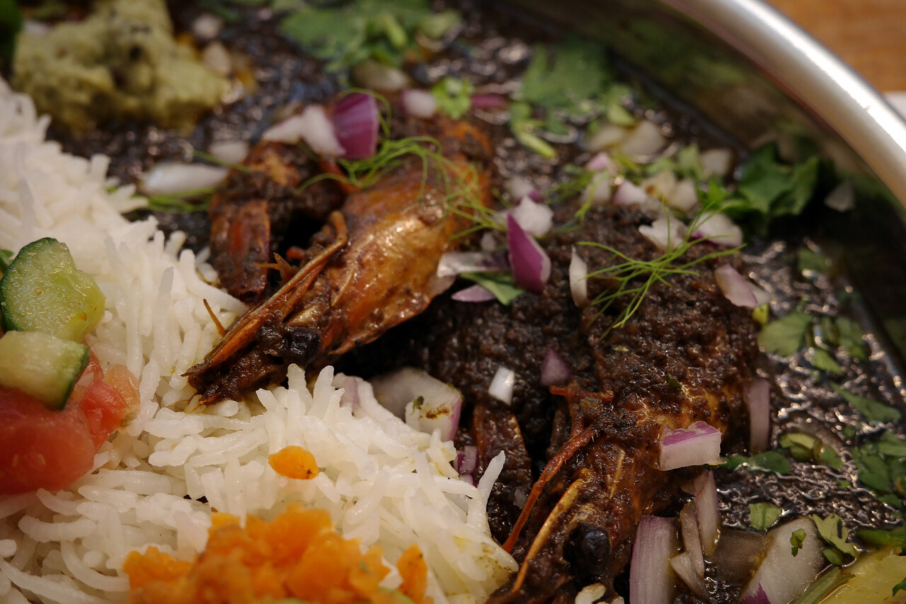 先日、東区香椎照葉で開催されたカレーフェスで知人に紹介されたので店舗に来てみた。今日のカレーは頭ごと殻ごと食べられる海老カレーとチキンカレー。兄弟カレーの合い掛け。