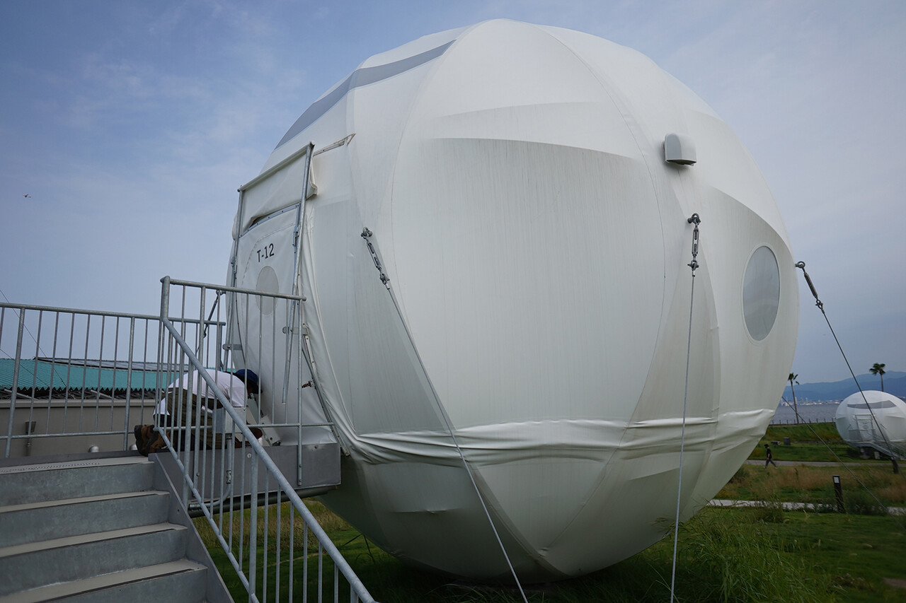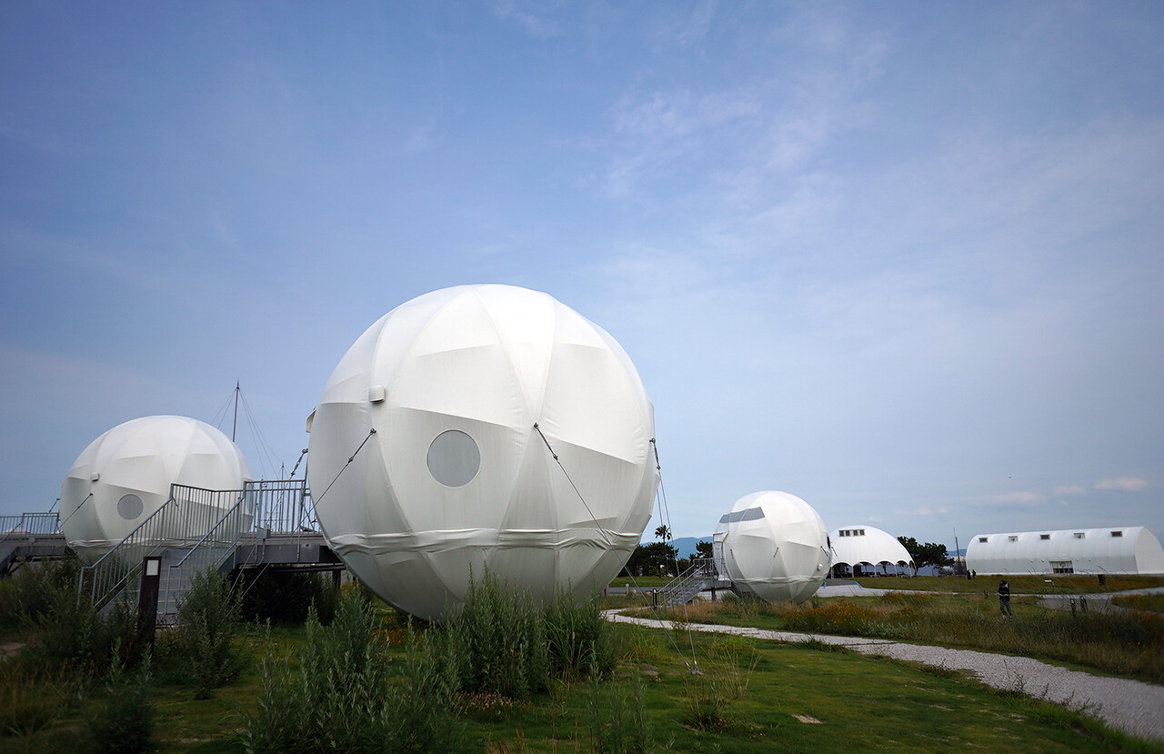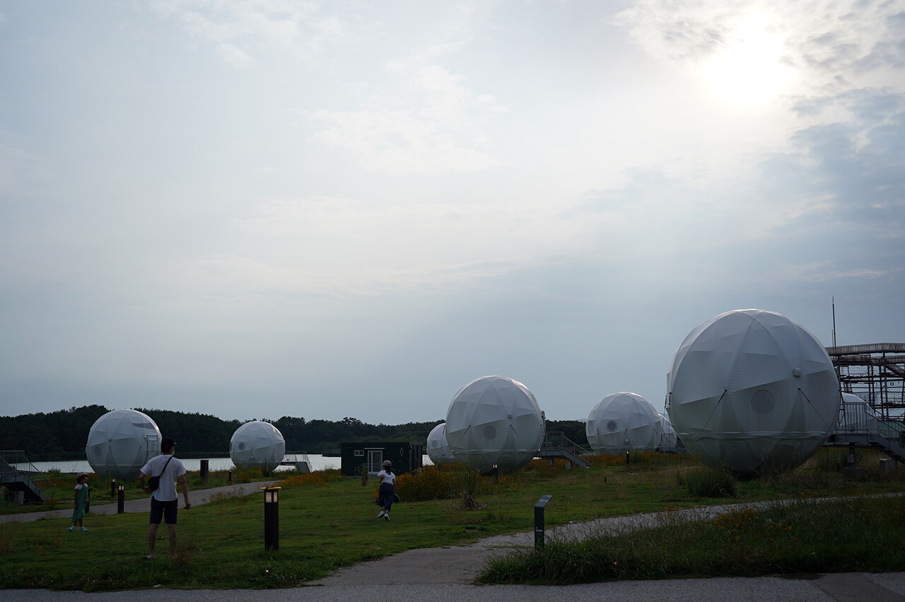 博多湾を臨む浜辺に球体テントやオシャレなコンテナ型キャビンや グランピングなどの宿泊施設がずらり。自然を生かした公園や、1日60円のドッグランエリア、アスレチックビルみたいな「シー・ドラグーン」。サンシャインプール、動物の森、乗馬厩舎、フラワーミュージアムなど、「海の中道公園」内をレンタル自転車などで移動すれば子供連れでも1日遊べる海浜公園ですね。