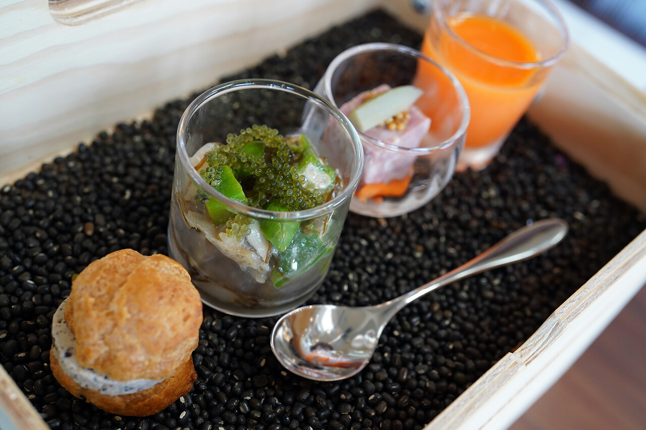 シェフは、国内の星付きレストランやホテルで修行後、2012年渡仏。 パリ6区"Le petit verdot"にてスーシェフとして研鑽した葭谷真輝(よしやまさき)さん。ちなみに趣味はスパイスカレーを作ることだって。確かに風貌はそんなアジアンな雰囲気がたっぷり。ランチでは彼が作るカレーが出るらしいのでそれも楽しみ。そしてスイーツなどを担当するスーシェフも葭谷さんとともにフランスでも仕事してた料理人。