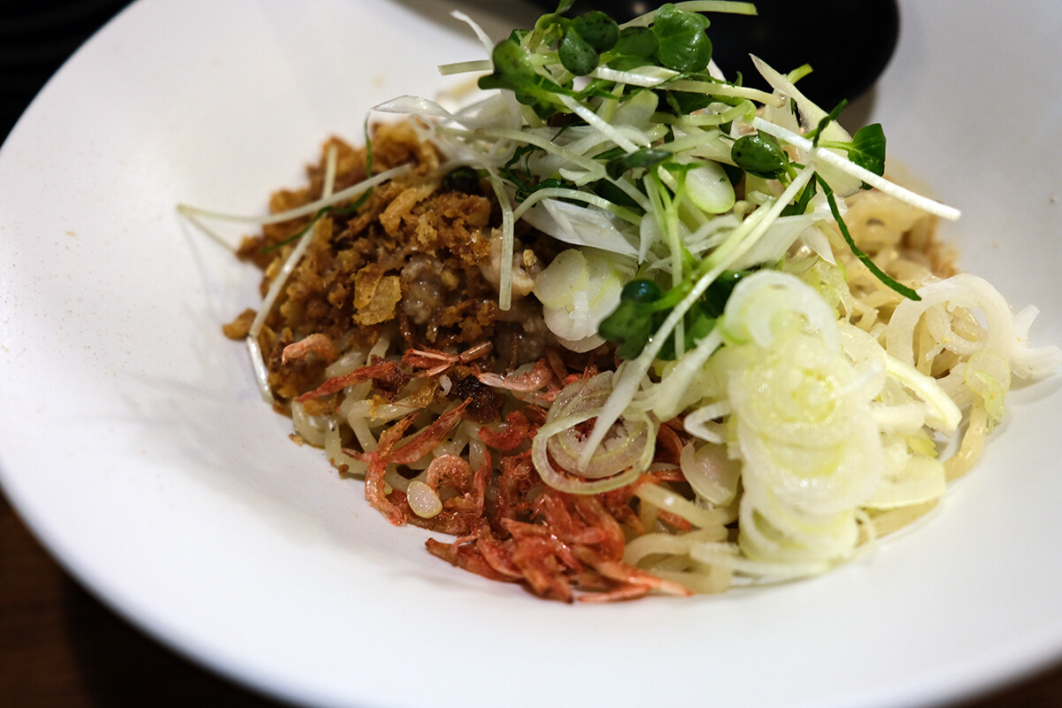 汁なし担々麺を食べたけど、モチモチした麺にオリジナルソースと薬味が個性的で美味しかった。全体的に一品料理全てにおいて一味違った個性が光る。これは【新博多醤油そば もやい】のラーメンにも通じる印象。
