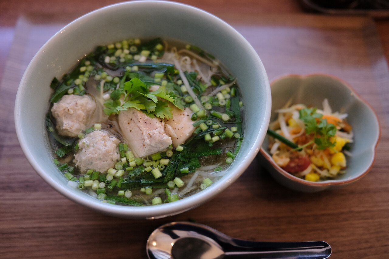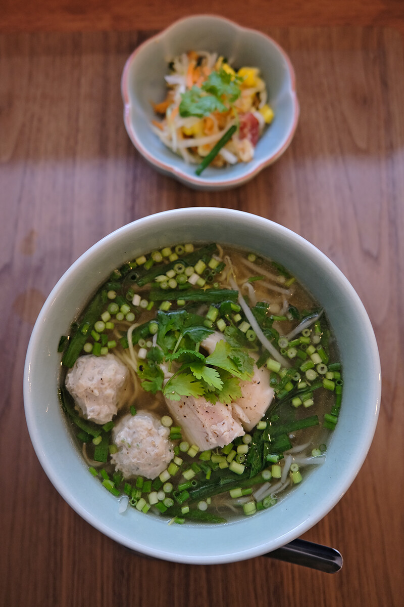 3種類ある麺料理から一番あっさりしてそうなクイッティアオナームを注文。鶏出汁のシンプルな醤油ラーメンと説明が書いてあったので。タイに行ったことないけどタイの屋台で売ってそう。