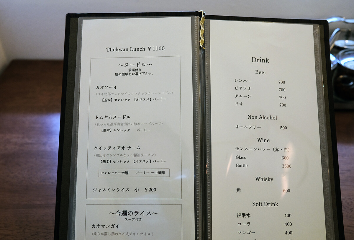 店名は【thuk wan】(トゥックワン)。意味は『日常』ということ。ノリさんいわく、「タイ料理をもっと広く色んな人に知ってもらって、その人達の日常に溶け込んでいきたいという想いでつけました。タイ料理をもっと気軽に楽しくという想いは【そいさぼ】、【ちょいさぼ】と同じです」とのこと。なるほど、素晴らしい。
