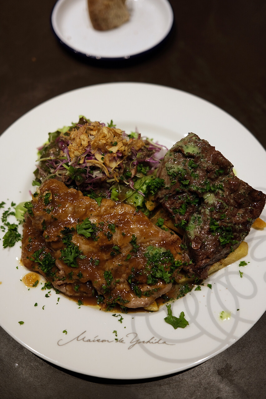 左がポークジンジャー、右がビーフステーキ。サラダとバゲット付き。