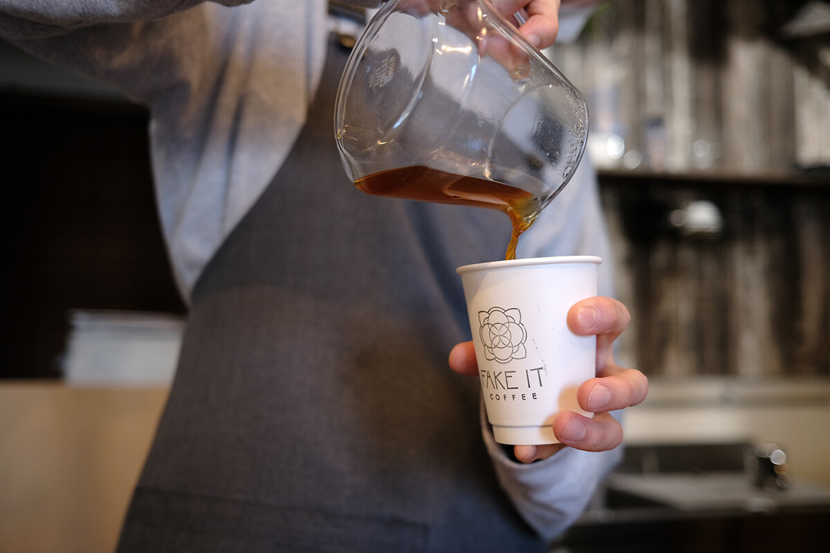 【FAKE IT COFFEE】では客の出入りが少ないタイミングだったので珈琲2杯でたっぷりお話。22歳のしっかり者の美人ちゃんに褒められて尊敬されて励まされている大瀬良店主でした。