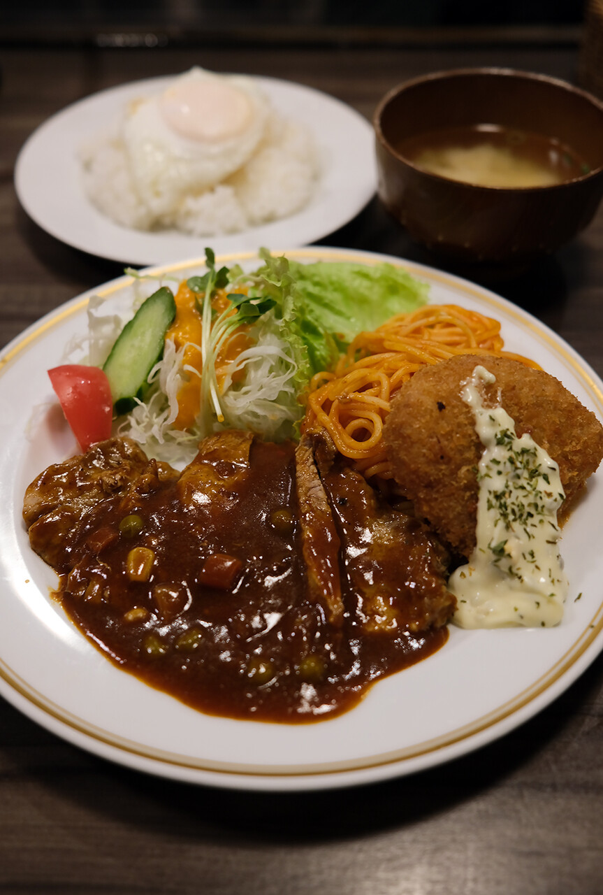 仕事帰りに東区松島【洋風食堂 枝】で晩ご飯。先週『UMAGA』でここのことを書いた記事が好評でたくさん読んでもらってるみたい。ありがとうございます。今日も日替わり定食に目玉焼きトッピング。910円なり。