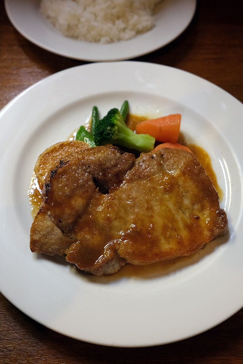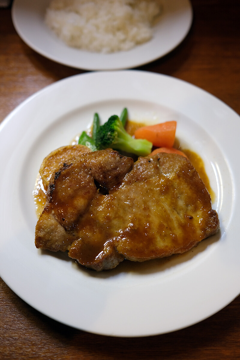 厚切りポークジンジャーはその名の通り豚肉の分厚さが迫力満点。熱々なフライパンの中で豚肉の脂が染み出したジンジャーソースがたまらん。分厚いのに柔らかく仕上げられてるのでライスに合う。ご飯がまた洋食に合うように炊かれているのよ。そしてフルサイズの日替わりスープ、今日はさつま芋のポタージュ。