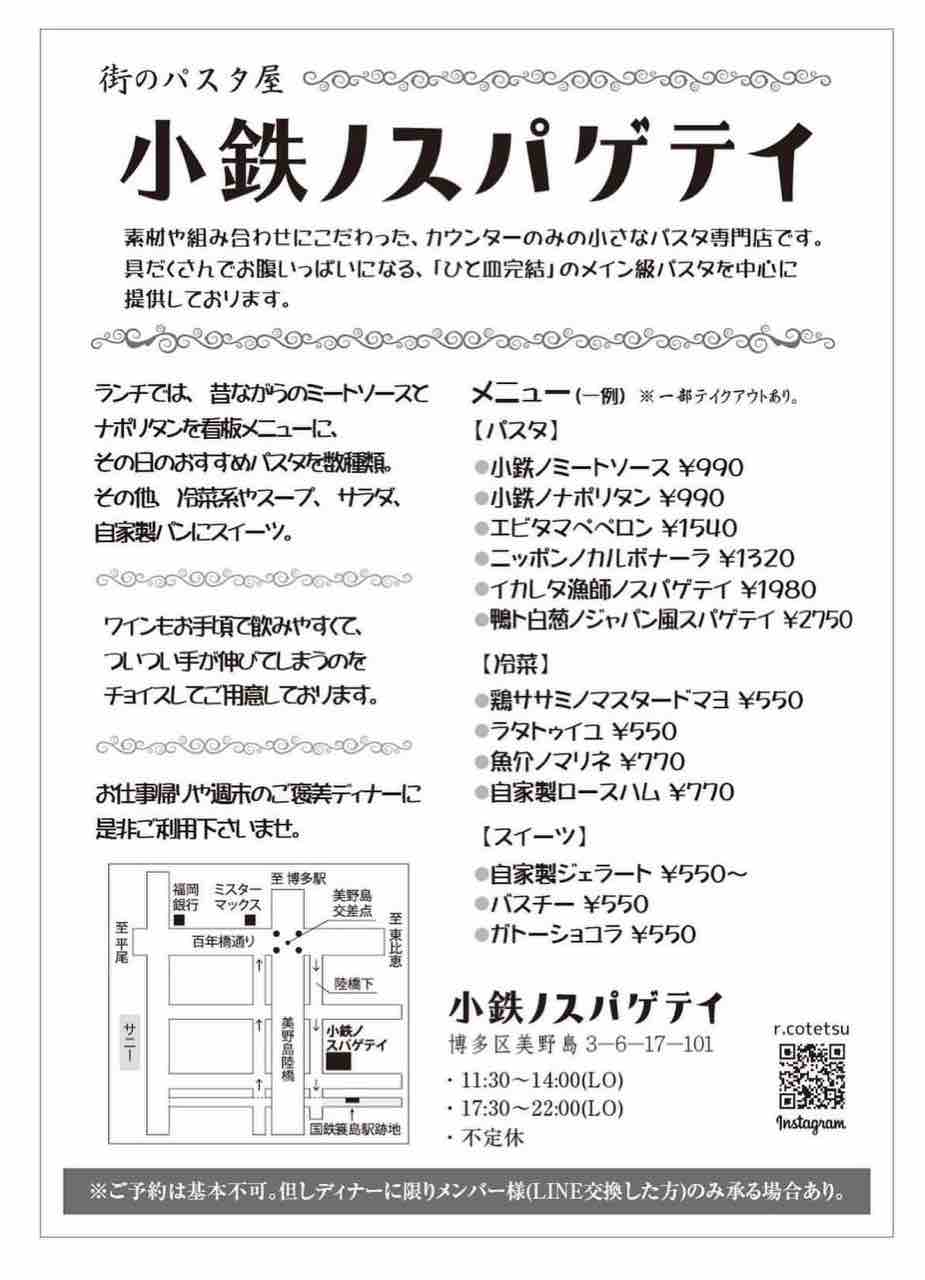 その小鉄さんがこの度、4/1に博多区美野島で【小鉄ノスパゲテイ】をOPEN。スパゲッティを中心にイタリアン惣菜やワインなどを楽しめるカウンターのみのレストランです。夜は、肉や魚と組み合わせたモリモリのスパゲッティもあり。ちょっと太めのモチモチな生麺が食べ応え満点。