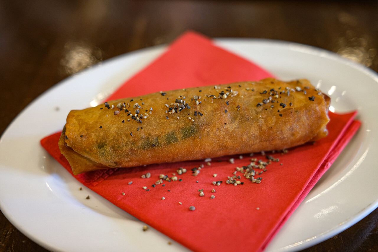 玉子好き、海老好き、ライス好きにはたまらんね。今日はニラダレ水餃子との組み合わせ。ミルク中華スープも美味しい。そして、おまけは夜メニューの青椒肉絲の春巻き。熱々でウマウマ。今日も杏仁荘ランチが食べられる平和に感謝。