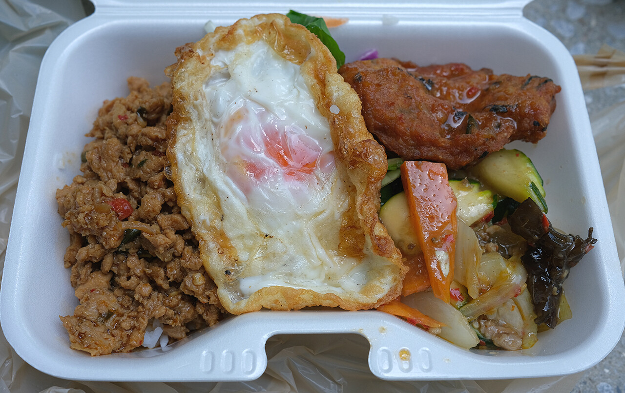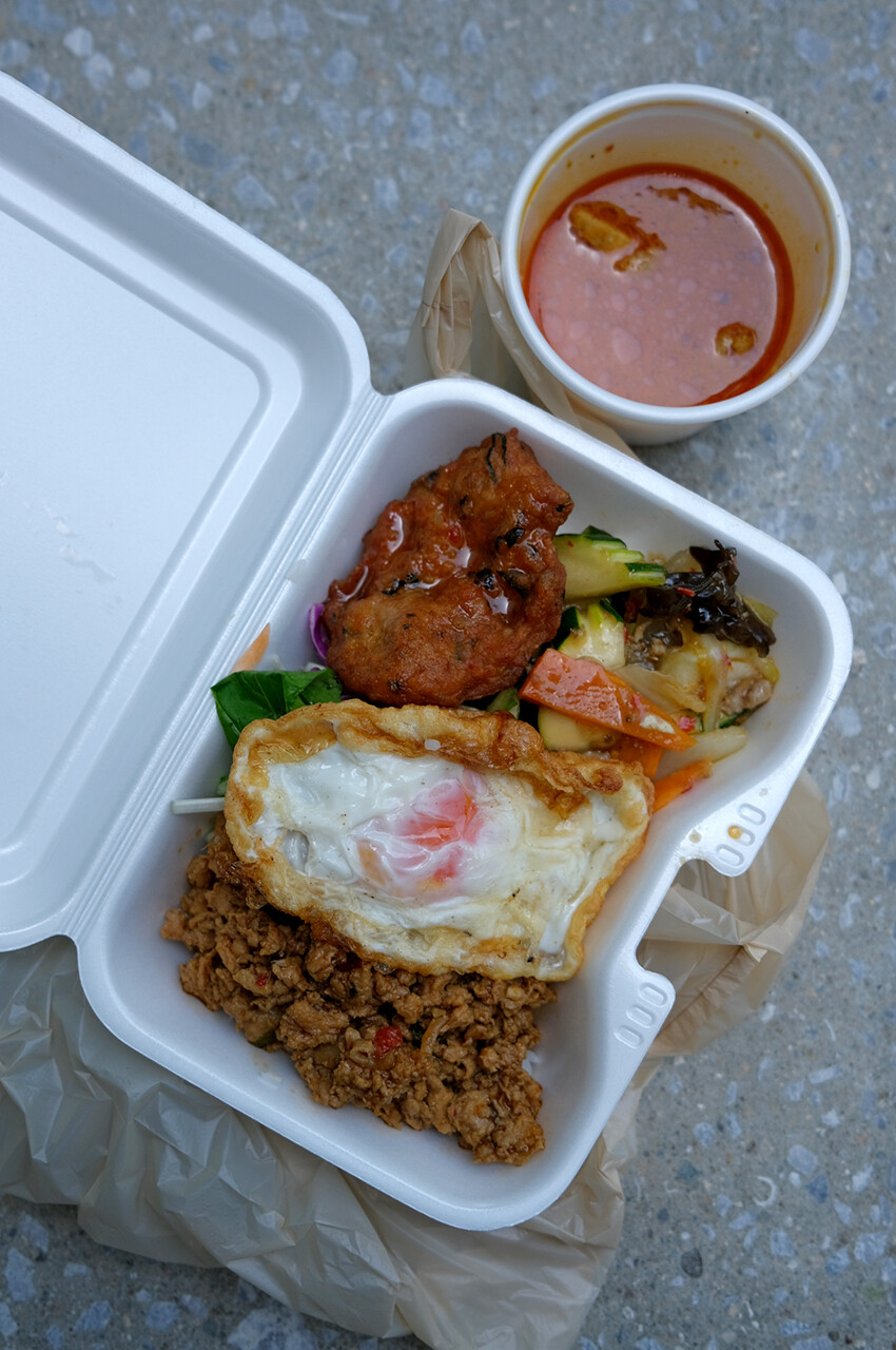 水曜日は博多出店ですが、1週おきで元博多スターレーン跡に出来た「博多イーストテラス」ということで、今日はそっちへ。4種類ある料理から1〜4種類を選択。いろいろ載せても1,000円くらいとお安く本場のタイ料理やカレーがいただけますよ。僕が食べたのは850円だったかな。
