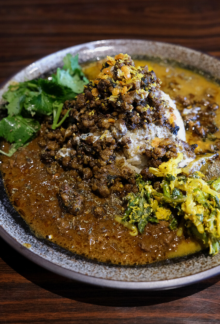 お昼に【キャンチョメ102】で3種合い掛けカレー。フェンネルキーマカリーの左右にビーフココナッツカレーと魚介出汁ダール。1,400円なり。